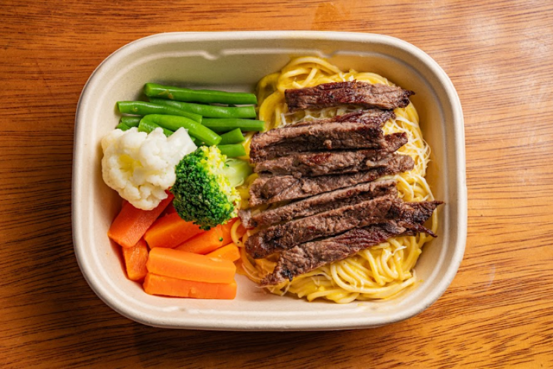 Tallarines en salsa huancaina con bisteck