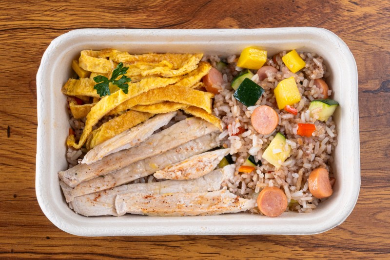 Arroz salteado con verduras de temporada, pollo y huevo.