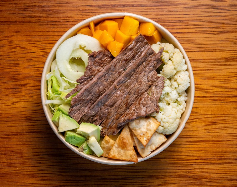 Ensalada fresca con mix de lechugas, zanahoria y tomate. Incluye champiñones, brócoli, mix de semillas, pepino, crutones y mango como toppings llenos de textura y color. La proteína a elecció