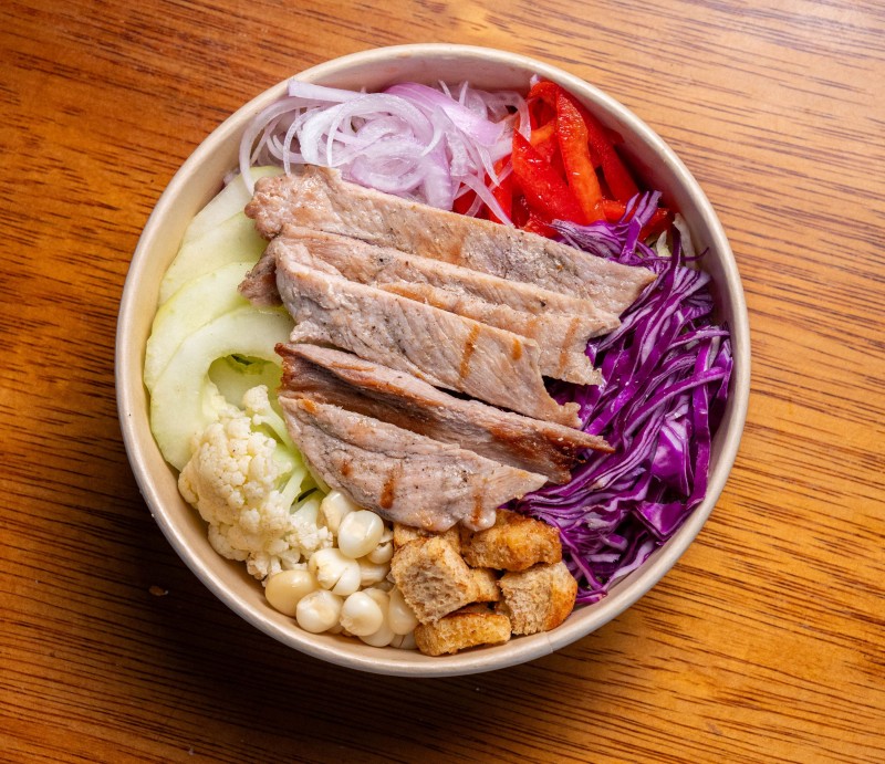 Ensalada liviana y refrescante con mix de lechugas, pimentón y pepino. Incluye aguacate, maíz tierno, crotones y coliflor como toppings que aportan textura y color. La proteína a elección com