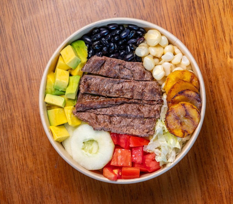 Ensalada fresca inspirada en el sabor paisa, preparada con mix de lechugas, tomate y pepino. Incluye maíz, fríjol, aguacate y crocante de plátano en cubos como toppings llenos de color. La pr