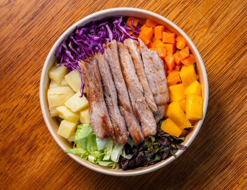 Ensalada fresca con mix de lechugas, zanahoria y repollo morado. Incluye mango en cubos, papa en cubos y cebollín como toppings llenos de color. La proteína a elección aporta balance, mientra