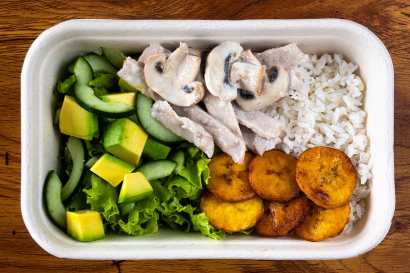 Pechuga de pollo asada a la plancha con salsa cremosa de champiñón, ensalada fresca de lechuga, tomate, cebolla, rodajas de plátano asado y arroz blanco.