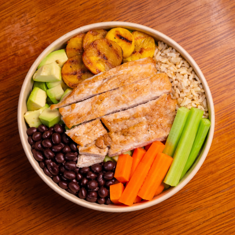 Plato tradicional Colombiano nutritivo de arroz achiotado ligero con cerdo en fajitas, fríjol negro, plátano maduro asado y guacamole natural y bastones de apio y zanahoria , una combinación