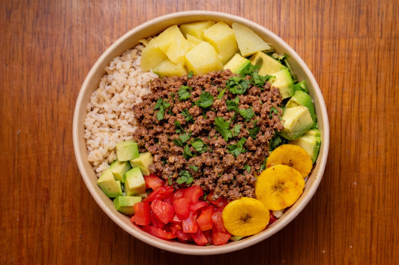 Plato tradicional colombiano balanceado de arroz achiotado ligero, carne molida magra, papa al horno y plátano maduro asado, acompañado de guacamole natural y ensalada cacera tomate cebolla l