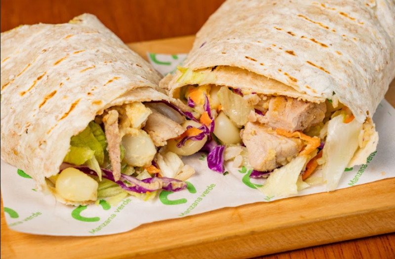 Tortilla de trigo saludable con las mas frescas hortalizas y los mejores ingredientes, cerdo, zanahoria, choclo, palta, col, champiñones y hummus