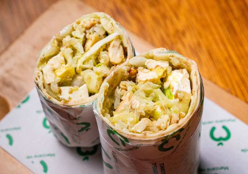 Wrap fresco y equilibrado en tortilla integral, relleno con lechuga crespa, pepino y tomate. Incluye quinoa cocida, aguacate, queso en cubos y semillas mixtas que aportan textura y nutrición.