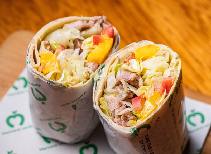 Wrap inspirado en la frescura del Pacífico colombiano, elaborado con tortilla integral y relleno de lechuga crespa, tomate y pepino. Incluye mango, cebolla morada y queso como acompañantes ll