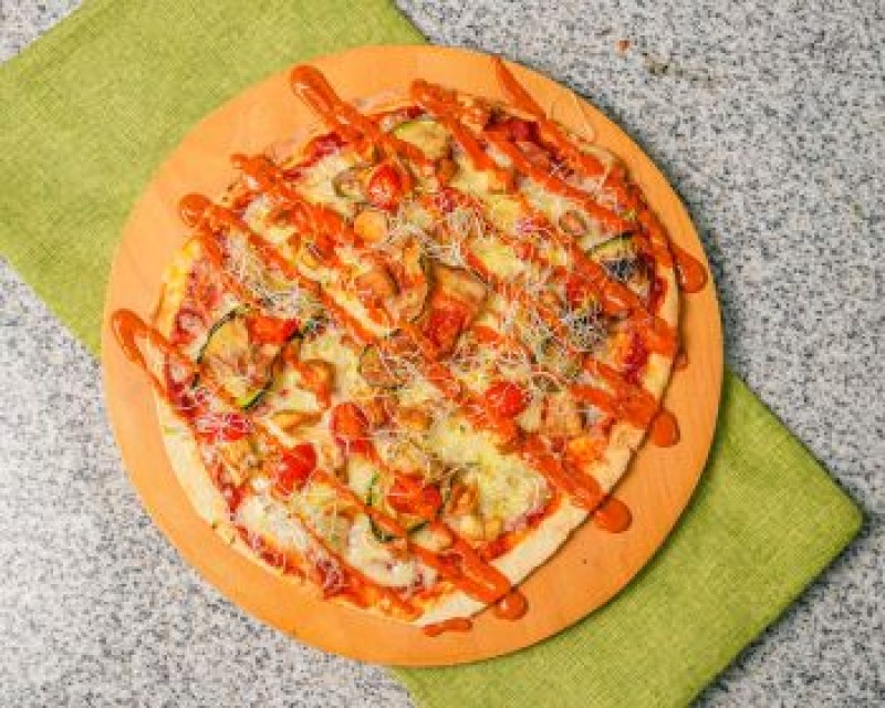 Pizza con masa libanesa, quesos, pechuga, zuccinis, germen de alfalfa, tomate cherry.. Rica en proteínas, carbohidratos y grasas, con buen sabor y fibra.