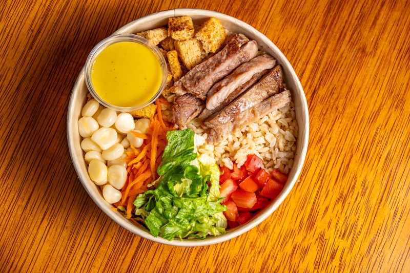 Elige tu proteína sobre una base de arroz integral, lechuga, tomate, maíz, noodles de zanahoria, crutones y vinagreta al gusto