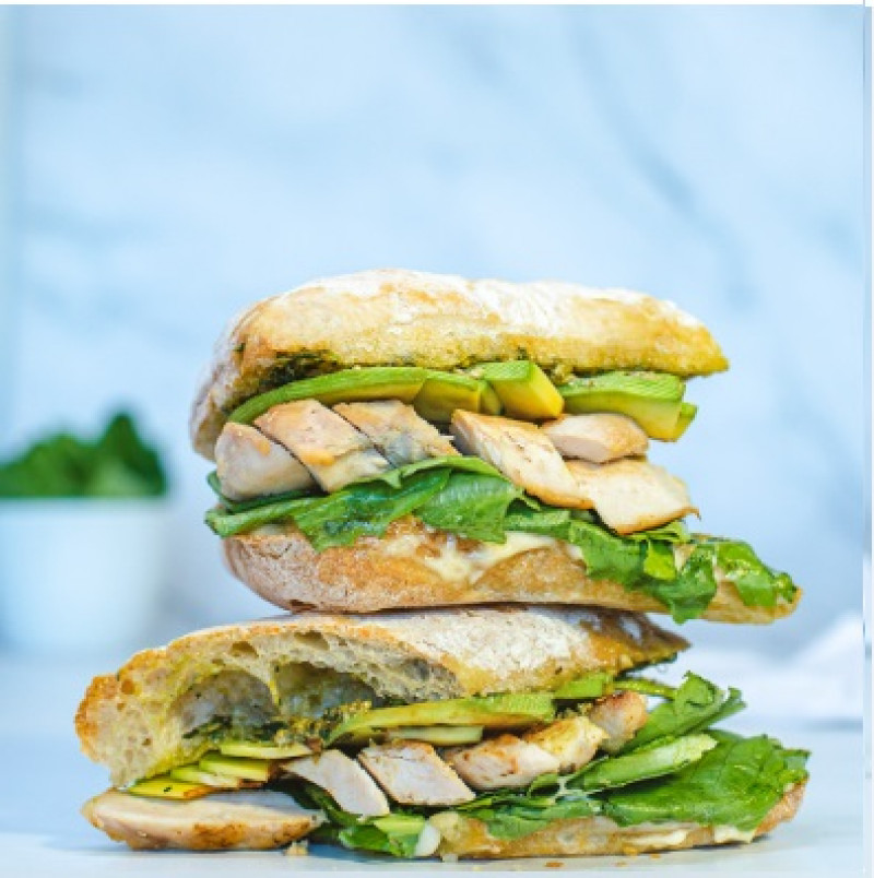 Sándwich rico en grasas y proteínas, con pan ciabatta, pollo grill, palta, salsa pesto y lechugas frescas.