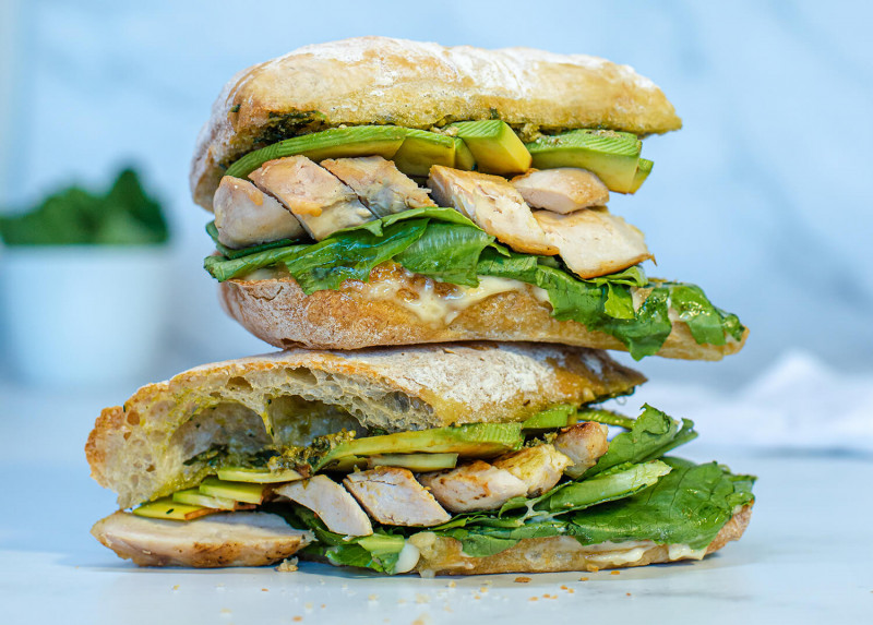 757kcal /48gr Prote/41gr Gr/59gr Carb. Sandwich con pan ciabatta de masa madre, pollo grill, palta, salsa pesto y lechugas frescas