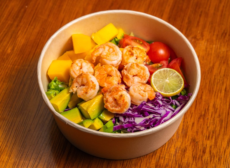 Elige tu proteína sobre un mix de lechugas, repollo morado, aguacate, mango, limón, proteína y vinagreta al gusto (recomendada balsámicar