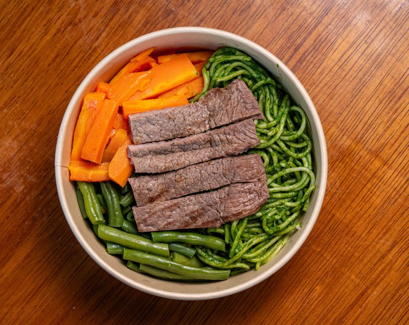 Filete de res acompañada de nuestra salsa pesto casera. Toques de albahaca y espinaca para completar un mix de verduras cocidas.