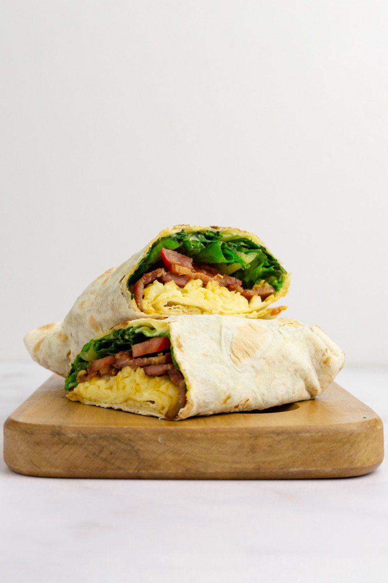 Wrap de tortilla integral con tocino con miel, queso mozzarella fundido, lechuga, tomate y mayonesa.