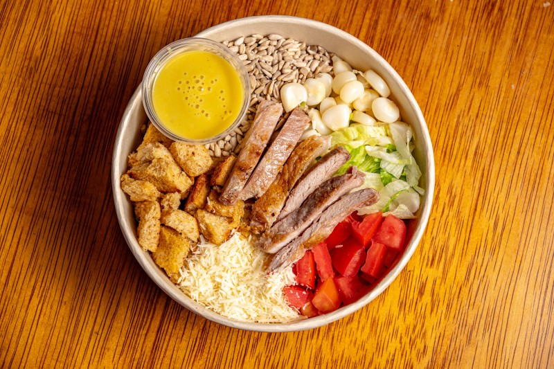 Ensalada nutritiva con Lechugas, crutones, semillas de girasol, parmesano, tomate y mani. Aporta proteínas, grasas saludables, fibra y vitaminas.
