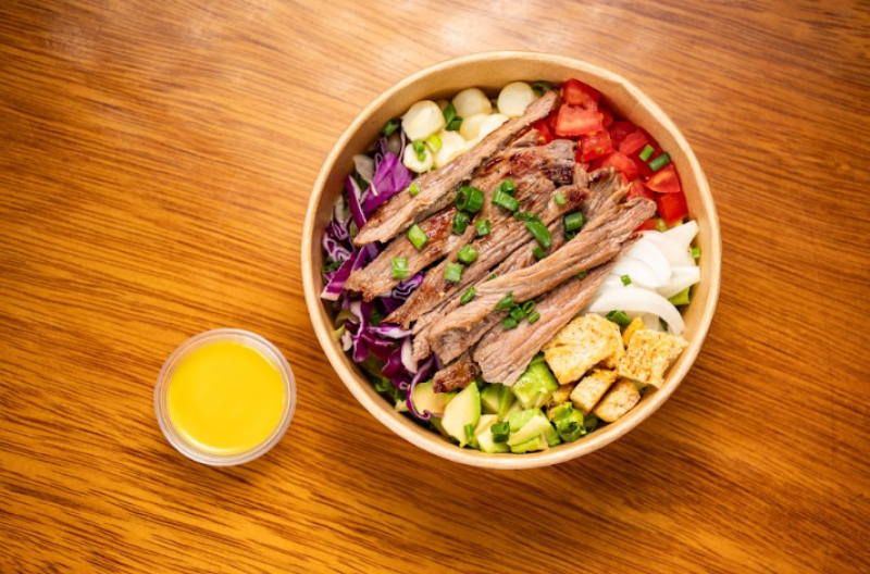 Bowl saludable con las mas frescas hortalizas, aguacate, crotones, choclo, pepinos, cebollín, cebolla en plumas, col rizada y bistec de res