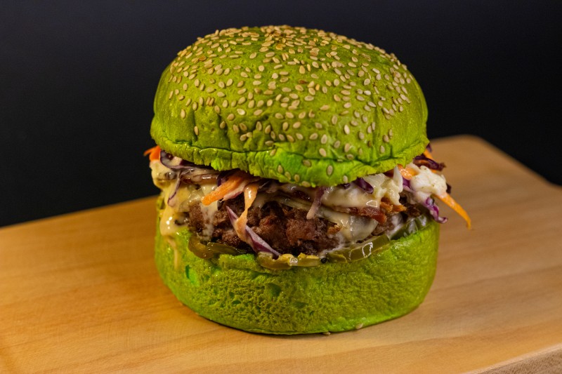 Hamburguesa carne de res, pan brioche de masa madre, jalapeños encurtidos, tocino artesanal, coleslaw vibrante, queso mozarella